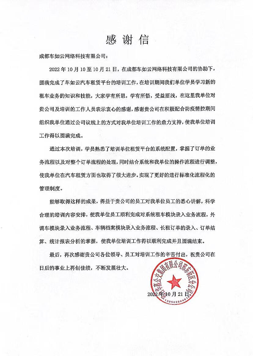 邢臺(tái)華贏公交集團(tuán)有限公司邢東新區(qū)分公司向成都車(chē)如云發(fā)來(lái)感謝信!