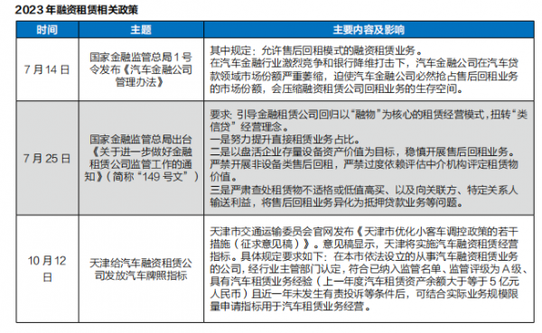 2023年汽車融資租賃行業(yè)處于行業(yè)整頓末期,多項(xiàng)政策相繼出臺(tái),對(duì)融資租賃市場(chǎng)進(jìn)行規(guī)范、修正與約束。主要內(nèi)容包括:引導(dǎo)金融租賃公司回歸以“融物”為核心的租賃經(jīng)營(yíng)模式,扭轉(zhuǎn)“類信貸”經(jīng)營(yíng)理念,包括對(duì)名租實(shí)貸的禁止、規(guī)范售后回租模式,鼓勵(lì)直租,努力提升直接租賃業(yè)務(wù)占比等。