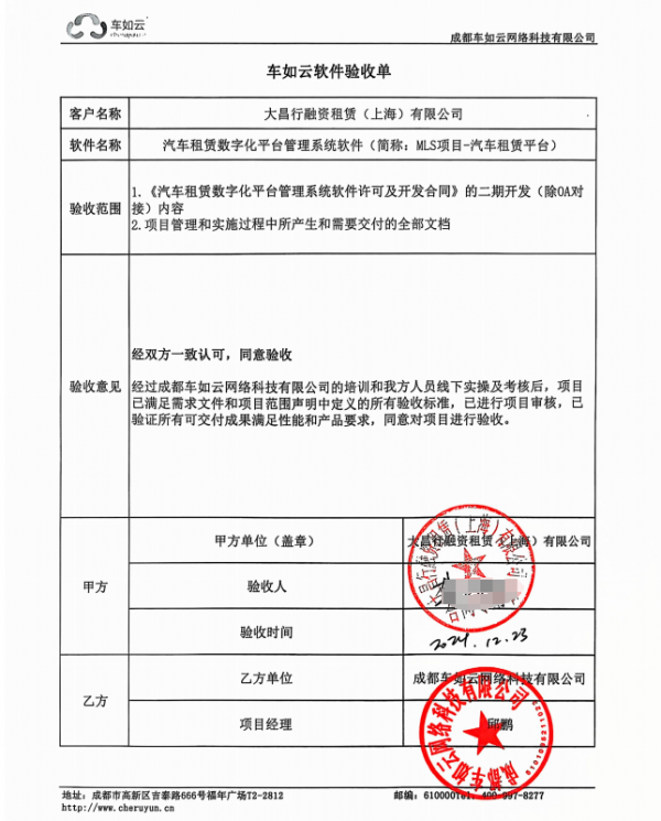 經過車如云與大昌行融資租賃(上海)有限公司雙方的共同努力,汽車租賃數字化平臺管理系統(tǒng)軟件二、三期成功交付驗收。